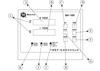 (D)ZERO按鈕:按下此ZERO按鈕,可將扭力荷重元的零點偏移值歸零,同時將顯示幕之+PEAK及-PEAK 扭力值歸零。