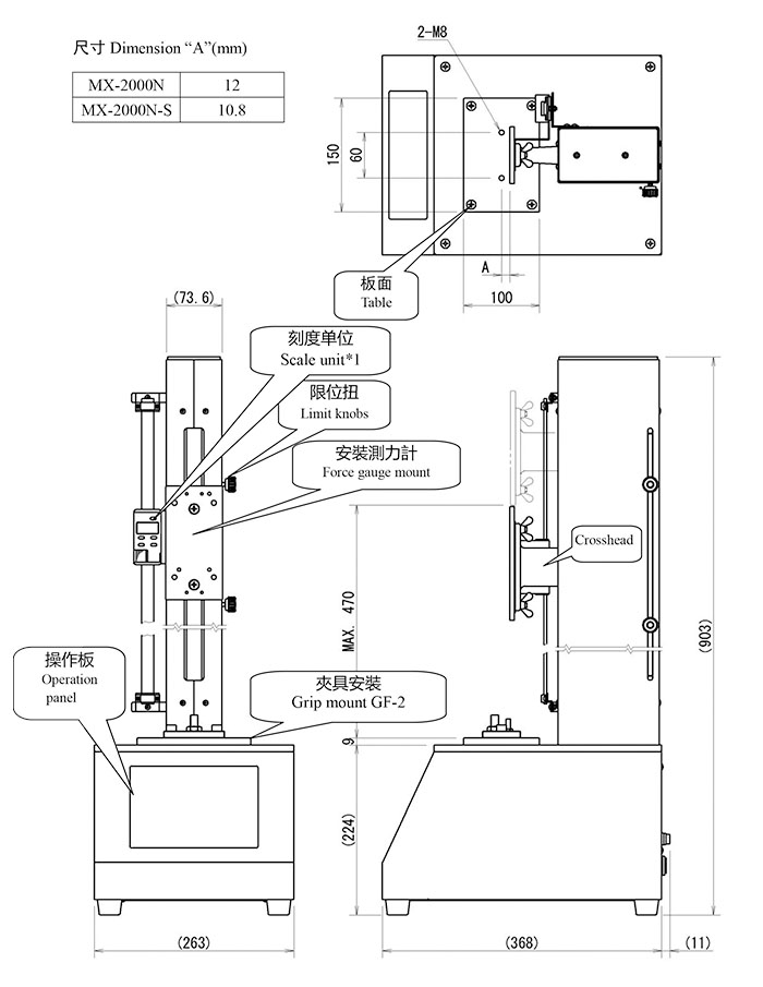 Capacity:2000N(Approx.200kgf) Stroke with gauge: 410mm